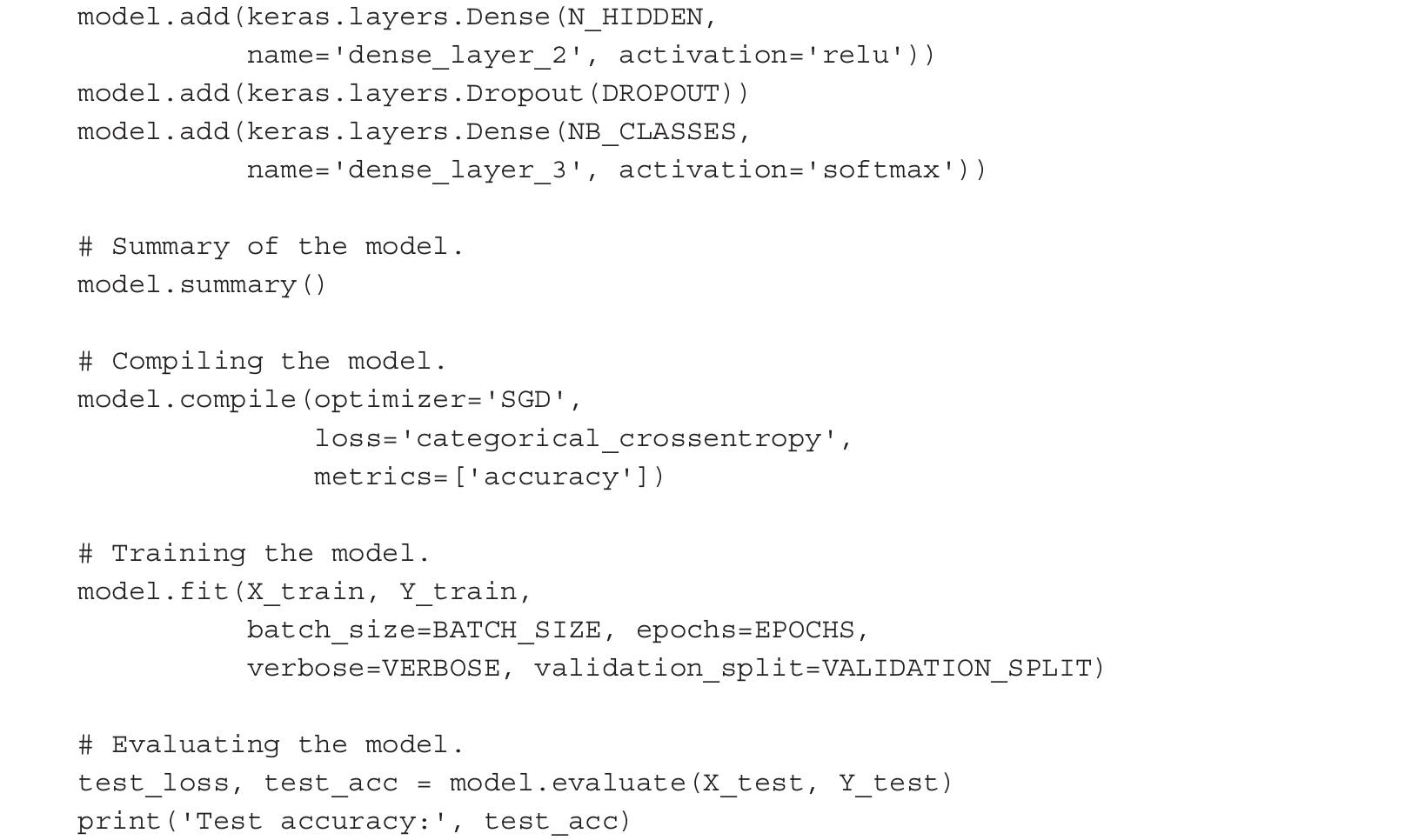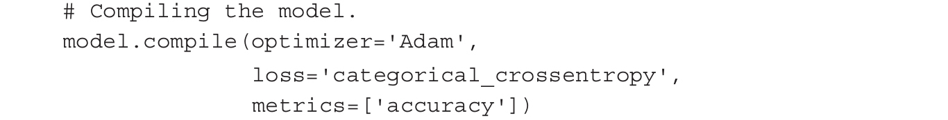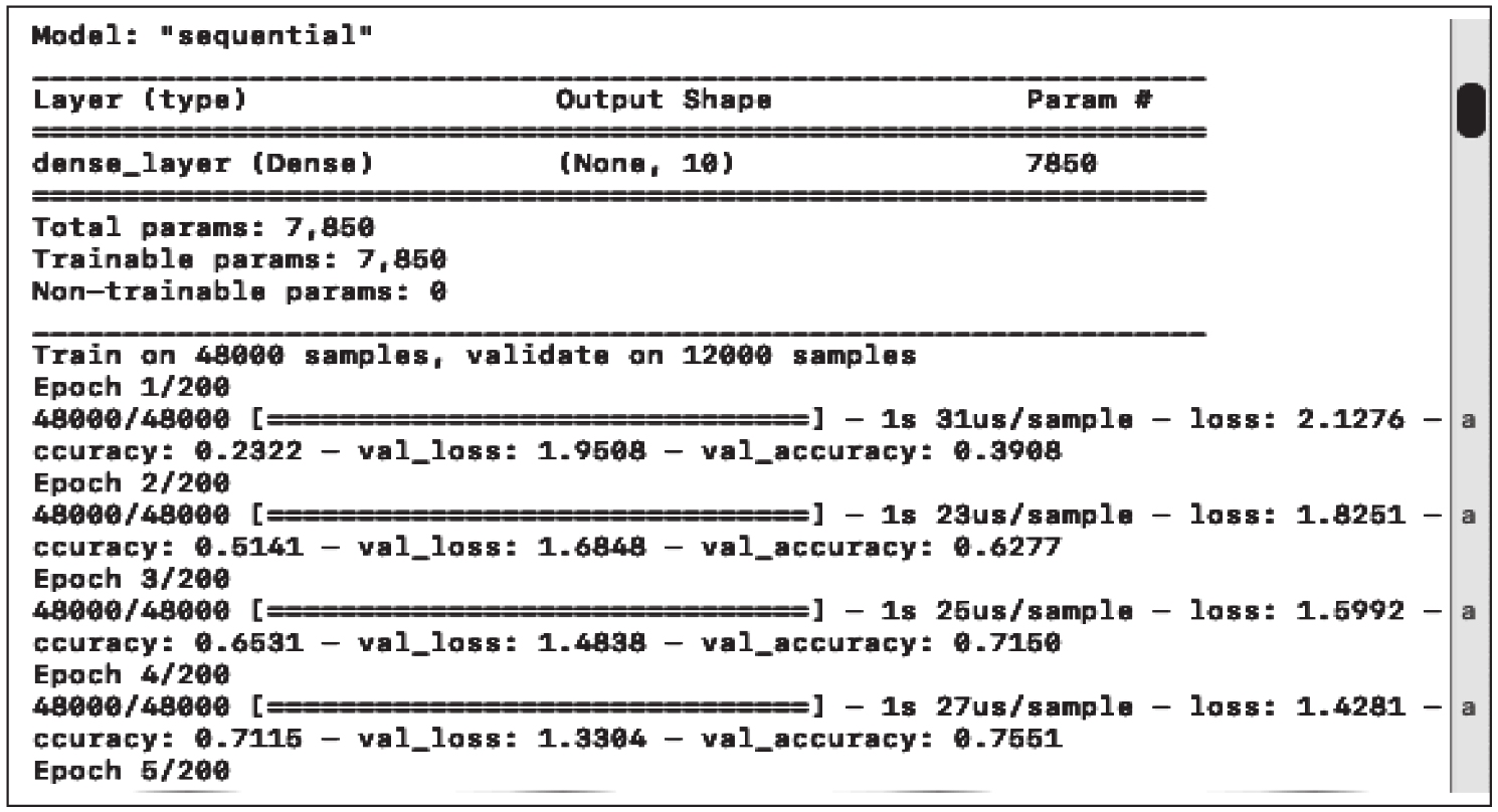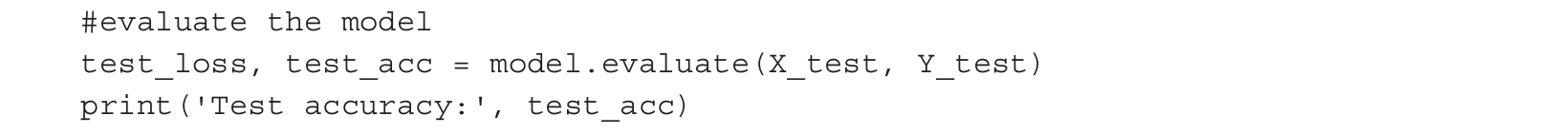 最后一层是使用激活函数softmax的单个神经元,它是sigmoid函数的通用形式。如前所述,当输入在(-∞, ∞)范围内变化时,sigmoid函数的输出在(0, 1)范围内。类似地,softmax函数将任意实值的实值K维向量“挤压”为(0, 1)范围内的实值K维向量,并使所有数值求和为1。在我们的代码例子中,它将前一层10个神经元提供的10个结果进行聚合。上述描述内容的具体实现代码如下所示:
