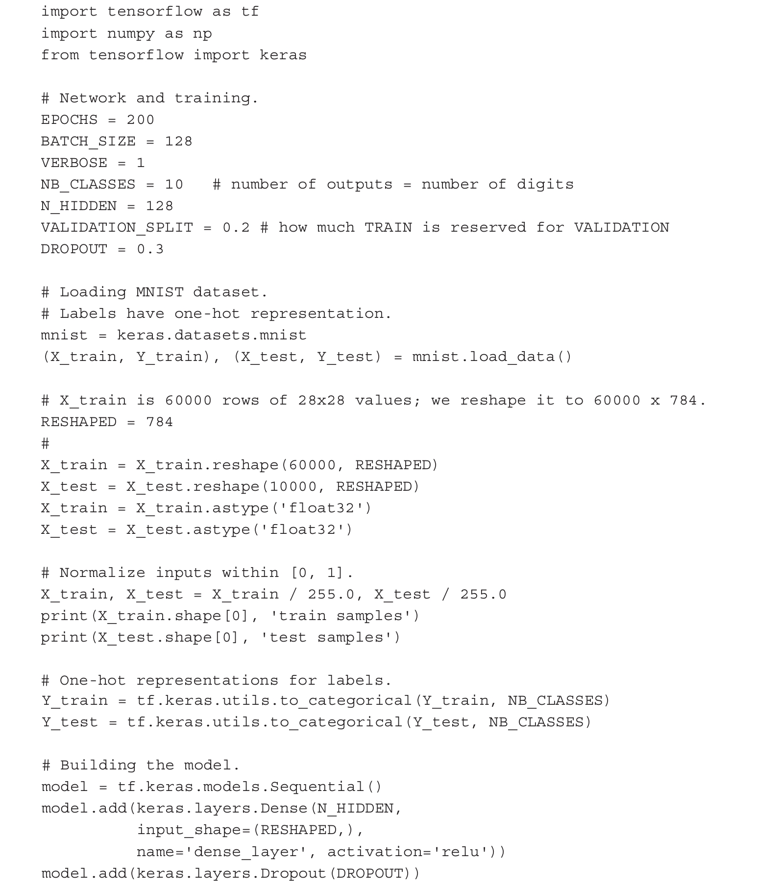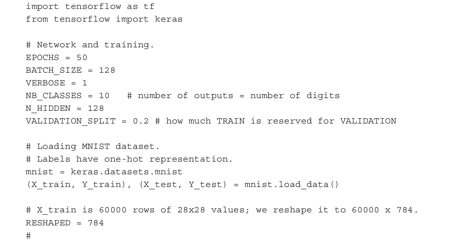 当下,不要过多地关注为什么某些参数有特定的赋值,这些将在本书的其余部分逐步讨论。直观地讲,EPOCH定义训练的持续时间,BATCH_SIZE表示一次输入网络的样本数量,VALIDATION是为检查或证明训练过程的有效性而保留的数据量。当本章后面探寻不同的值和讨论超参数优化时,你将理解选择参数设置EPOCHS=200、BATCH_SIZE=128、VALIDATION_SPLIT=0.2和N_HIDDEN=128的原因。TensorFlow中神经网络的第一个代码片段如下所示: