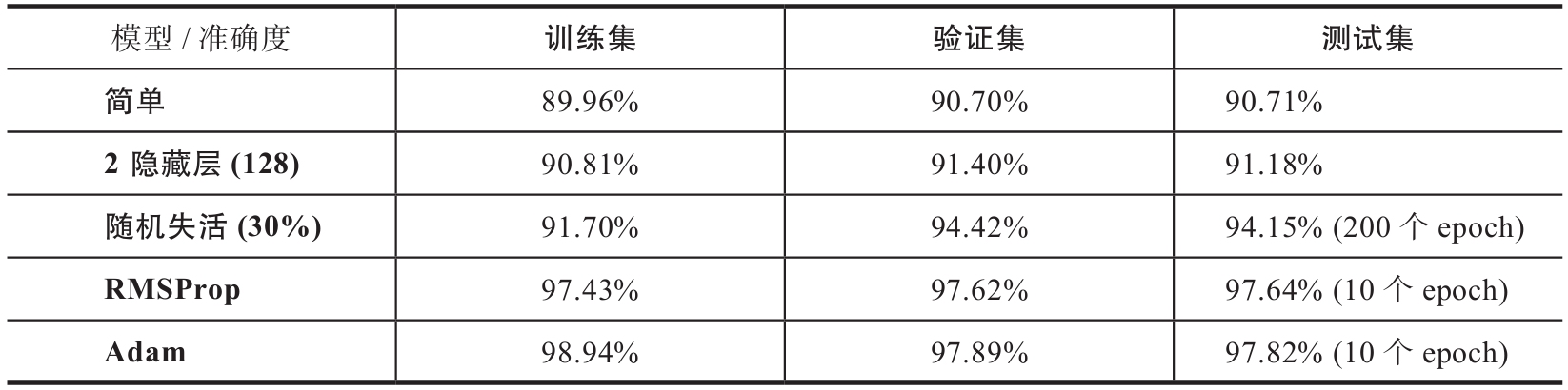 至此,总结一下:通过5个不同的可变因素,我们将性能从90.71%提高到97.82%(见表1-1)。首先,我们在TensorFlow 2.0中定义了一个单层神经网络。然后,添加隐藏层来提高性能。之后,在网络中添加随机失活,进而试验不同类型的优化器来提高测试集上的性能。