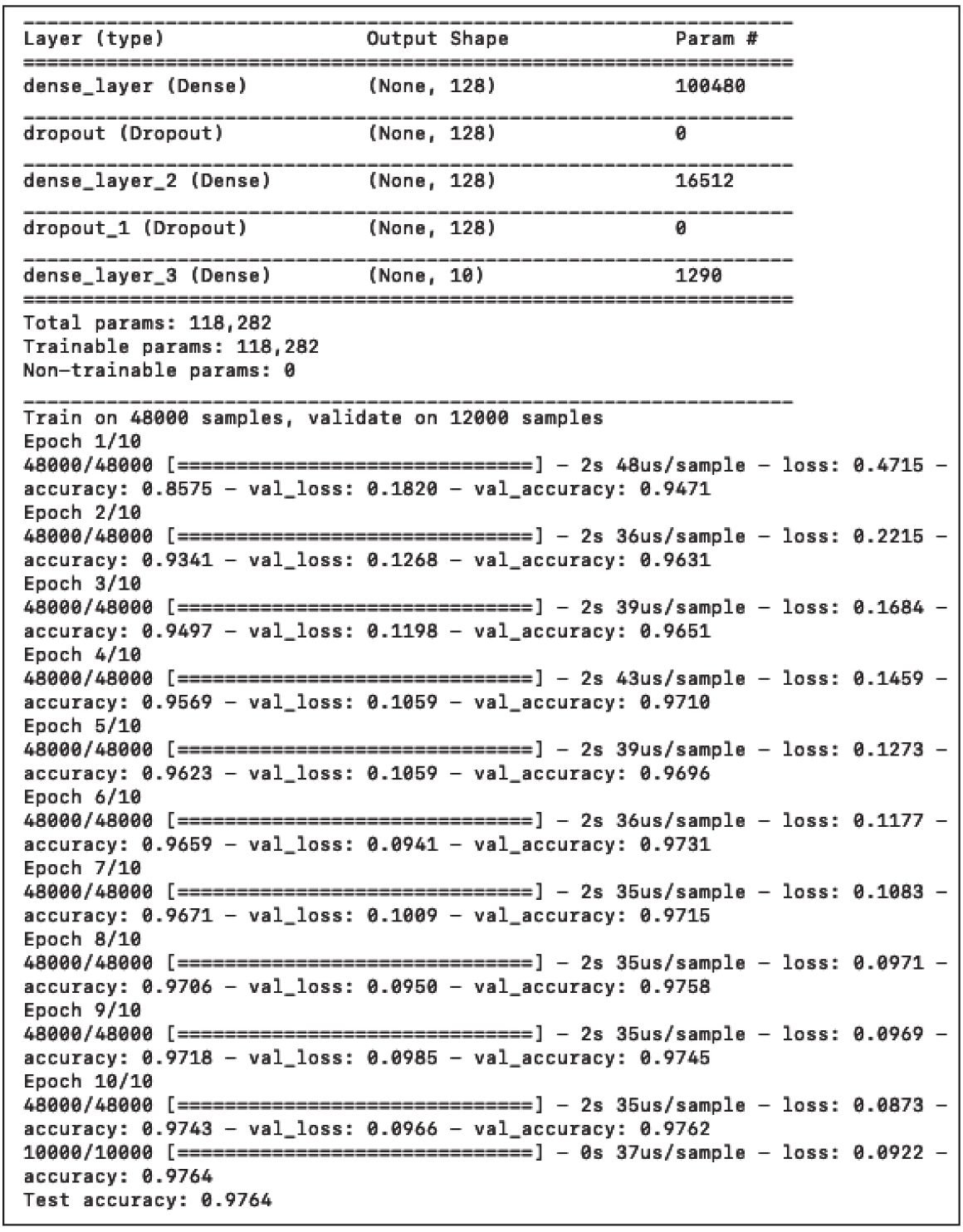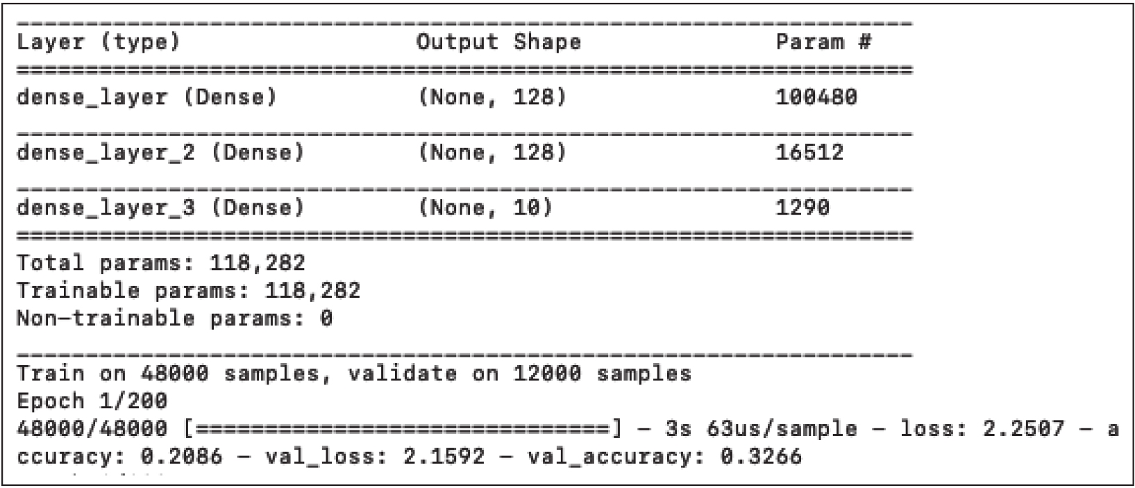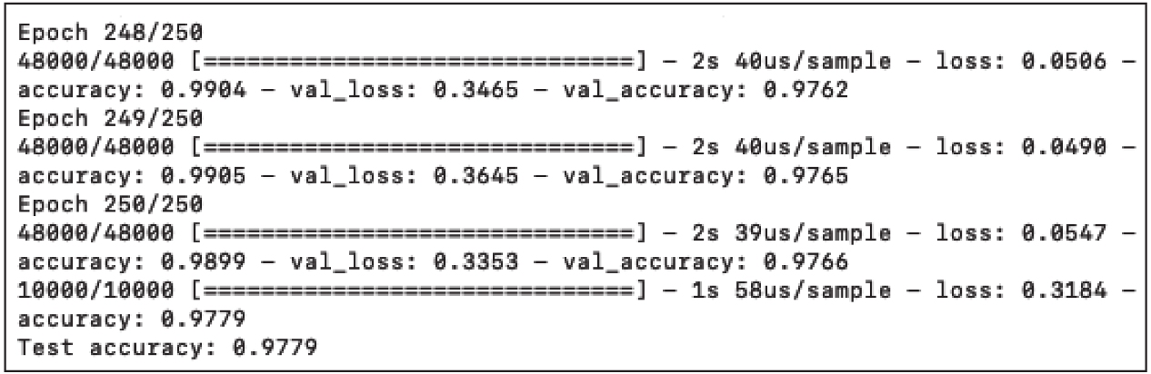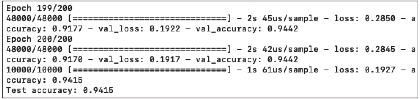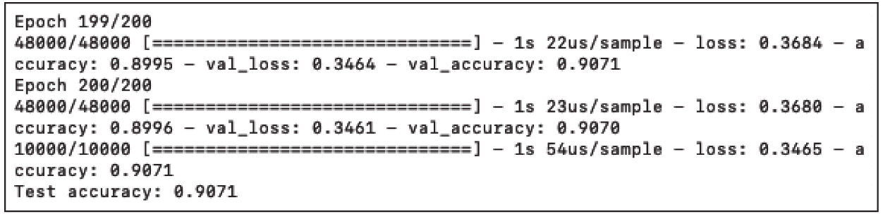首先输出的是神经网络的架构,可以看出层的类型(Layer(type))、输出形状(Output Shape)、待优化的参数数量(即权重(Param#))以及它们的连接方式。然后,使用48 000个样本训练网络,并保留12 000个样本进行验证。一旦神经模型创建完成,就用10 000个样本对其进行测试。目前,我们不会深入讨论训练的实现方式,但是可以看出程序运行了200次迭代,每次准确度都有所提高。训练结束后,在测试集上测试模型,训练集达到了约89.96%的准确度,验证集达到了90.70%,测试集达到了90.71%。如图1-14所示。