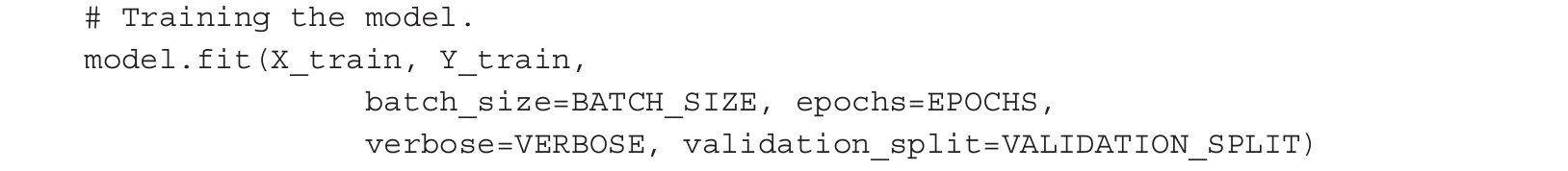 随机梯度下降(Stochastic Gradient Descent,SGD) (参见第15章)是一种特殊的优化算法,用于减少神经网络在每次训练周期后的误差。在下一章中将回顾SGD和其他优化算法。一旦模型被编译,即可用fit()方法对其训练,该方法指定了一些参数: