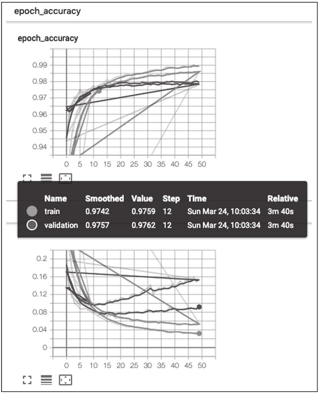 随着迭代次数增加,准确度在训练集和测试集上逐渐提升(见图1-12)。图中,两条曲线大约在15个epoch处交汇,也就是说,无须在该点之后继续训练网络(图像是使用TensorFlow标准工具TensorBoard生成的)。