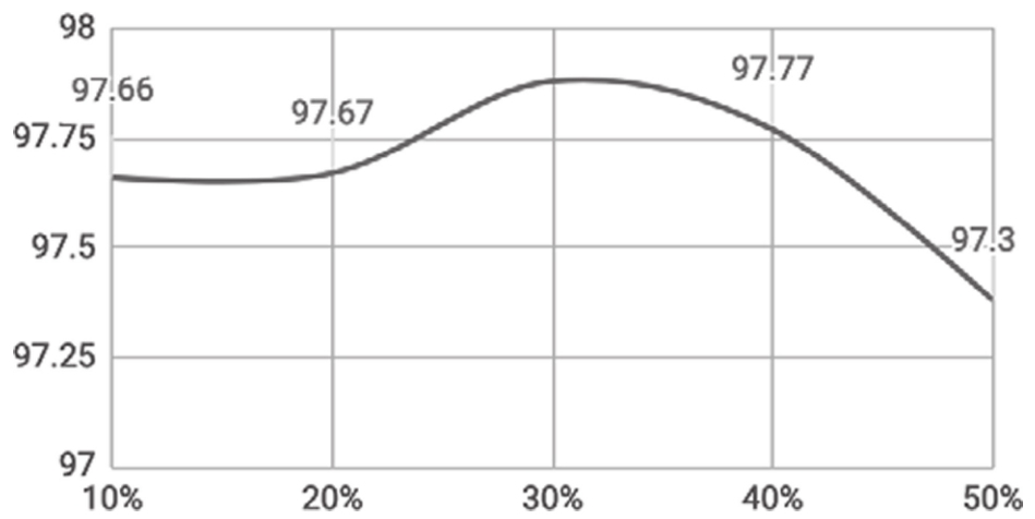 这是介绍的第5种派生算法,初始基准为测试集90.71%的准确度。截至目前,我们已经做到了逐步改进。然而,增益也越来越难以获得。上述优化采用了30%的随机失活。出于完整性,在测试数据集上记录不同随机失活的准确度会很有用处(如图1-24所示)。在上述示例中,我们选择Adam()作为优化器。还应注意,优化器的选择不能凭空臆定,基于具体问题选择不同的优化器组合会获得不同的性能。