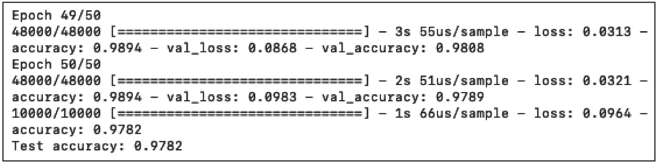 图1-15显示了运行的初始步骤,图1-16显示了最终结果。图1-16显示,通过添加两个隐藏层,准确度在训练集上达到了90.81%,在验证集上达到了91.40%,在测试集上达到了91.18%。测试准确度较之前提高了,并且迭代次数从200次降到了50次。这很好,但是我们还希望提升更多。