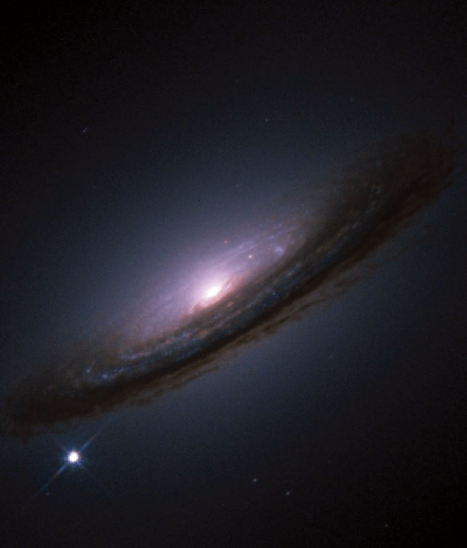 图中的碟状星系下方有一颗正在爆炸的明亮恒星,正是这样的星星帮助天文物理学家确定了一件事:宇宙膨胀的速度超出我们的预期。