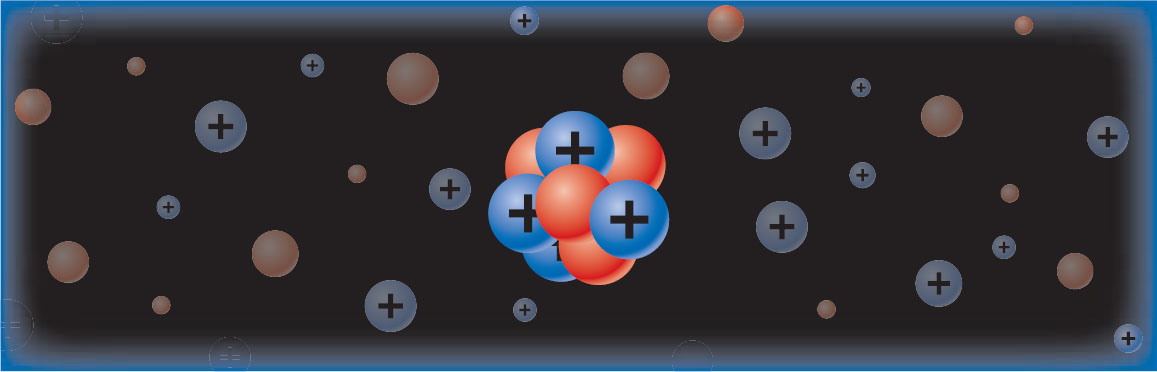 宇宙的直径已经膨胀到了几光年,大约相当于太阳和离它最近的恒星之间的距离。温度降到了10亿开氏度。这还是很热,足以“烹制”小小的电子和它们的搭档——正电子。这两种粒子不断诞生,彼此湮灭,然后消失。但电子和其他粒子都遵循同一条法则:它们有十亿分之一的概率幸存下来。