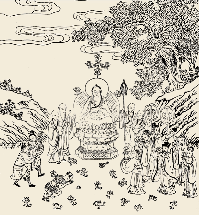且说善慧带着七茎莲花,来到普光佛所,“见灯照王已到佛前,最得在初供养礼拜。如是次第,至诸大臣,亦各礼敬,并散名花,花悉堕地。于时善慧与五百弟子,见诸人众供养毕已,谛观如来相好之容,又欲济拔诸苦众生,亦欲满足一切种智故,即散五茎,皆住空中,化成花台。后散二茎,亦止空中,夹佛两边。尔时国王及其眷属,一切臣民,天龙,夜叉,乾闼婆,阿修罗,迦楼罗,紧那罗,摩睺罗伽,人非人等,见此奇特,叹未曾有。于是普光如来,以无碍智,赞善慧言:‘善哉善哉,善男子,汝以是行,过无量阿僧祇劫,当得成佛,号释迦牟尼如来、应供、正遍知、明行足、善逝、世间解、无上士、调御丈夫、天人师、佛世尊。当于善慧受记之时,无量天龙,夜叉,乾闼婆,阿修罗,伽楼罗,紧那罗,摩睺罗伽,人非人等,散众妙花,满虚空中。”