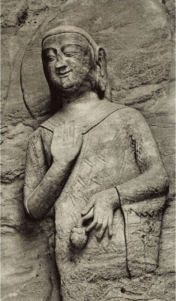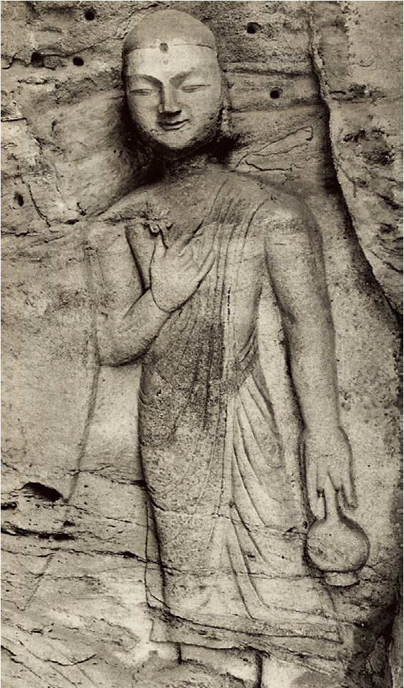 随着佛教的传入,给中华民族带来了香花供养的新风俗。前文说到,有关插花活动的最早文字记载见于南朝宋,而以花供佛的文献与图像出现要稍早一些。东汉时竺大力、康孟祥所译《修行本起经》卷上载:“须臾佛到,知童子心,时有一女,持瓶盛花,佛放光明,彻照花瓶,变为琉璃,内外相见。”这里说到的“持瓶盛花”,是发生在印度的事情。但在东汉桓、灵之际产生的中国最早佛教摩崖造像,江苏连云港孔望山佛教摩崖造像,在中心坐佛的身边,有一位供养人,头戴翅帽,高鼻深目,右手持三瓣莲花以奉佛。而据文字记载,手持鲜花的形象,在中国有可能出现得更早。宋洪迈《夷坚志》中说,“成都府汉文翁石室壁间,画一妇人,手持菊花,前对一猴,号菊花娘子”,据说其是汉宫女,因饮菊花酒而成仙。按汉文翁石室建于西汉景帝末年,只不知此画是否即同时所绘。而《晋书》卷九十五《艺术传·佛图澄》中,则记载了一个类似戏法的小故事,石勒召见佛图澄,“试以道术。澄即取钵盛水,烧香咒之,须臾钵中生青莲花,光色曜日”,佛图澄因此得到石勒的信用,为其在后赵传播佛教打下了基础。
