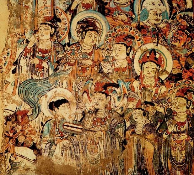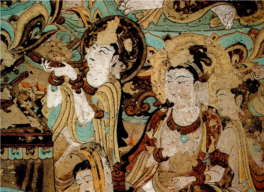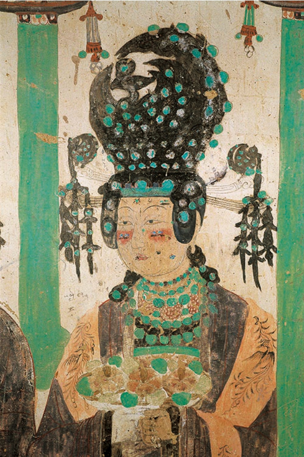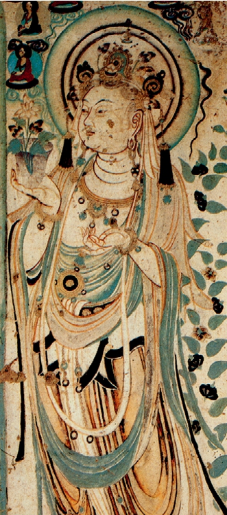 敦煌壁画中,供花是常见图案,许多石窟壁画中,都有手持花盘的飞天。第三十六窟壁画中,有菩萨双手捧托盘中盛多种花果。六十一窟壁画中的两位女供养人,各手托盘盛花果。一零三窟《都督夫人礼佛图》,多位供养人头簪鲜花,又有手捧花枝或盘花的;夫人和女儿华丽衣裙上装饰的,也是小簇折枝花卉。一一二窟壁画,有菩萨手捧盘盛莲花。一九九窟初唐壁画中的观音菩萨,右手托广口杯中插莲花莲蕊。榆林石窟壁画中,也有吉祥天女手捧托盘,盘中琉璃净瓶,插一枝莲蕊,两片莲叶。新疆吐鲁番柏孜克里克石窟第一六九窟,十世纪前后的壁画中,回鹘王侯家族供养人群像,每人手中持鲜花一束,造型各异。而高昌故城出土时代稍早的回鹘王像麻布幡,画中的回鹘王手持鲜花,一枝两朵三层绿叶,成重台状。