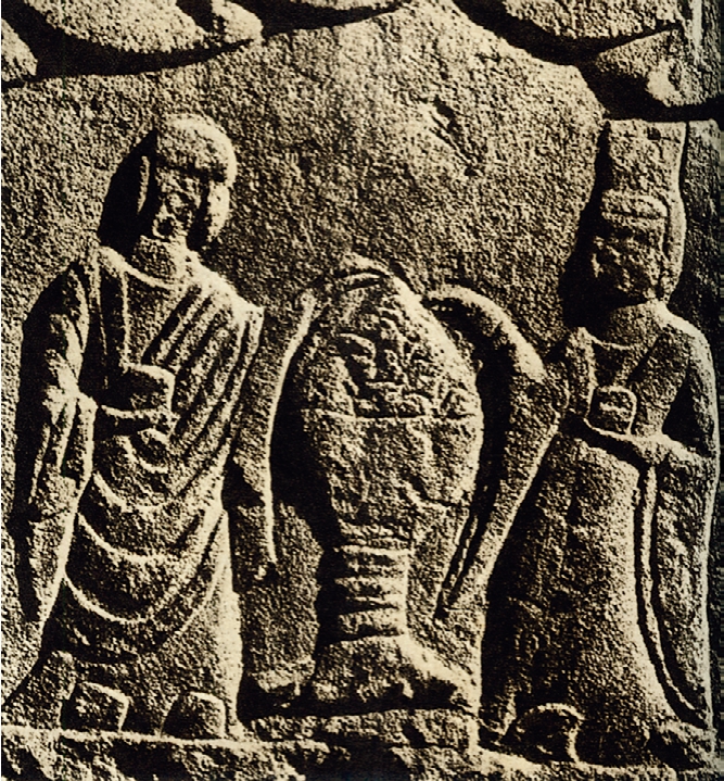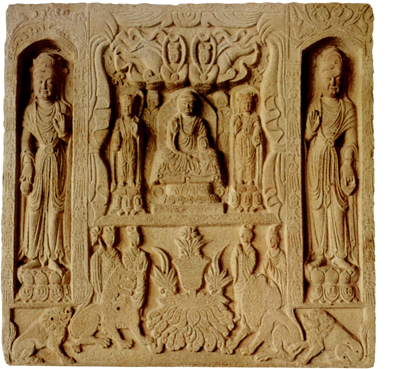 北周佛教造像。佛像下方两供养人之间,莲座花瓶中插着一枝高大的莲花