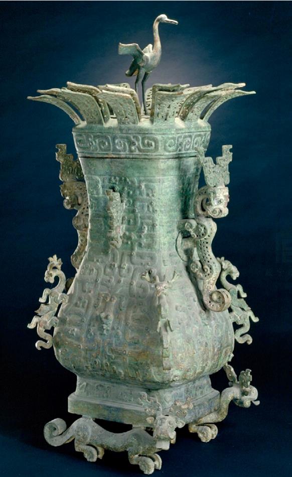 2 河南新郑出土蟠螭纹莲鹤方壶;壶盖周边饰双重莲瓣纹