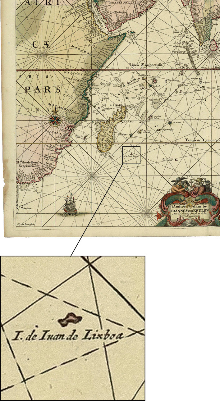 在由范·科伊伦出版、彼得·古斯绘制的《新东方地图》(1680)中,里斯本胡安岛(图中标注为“I.de Juan do Lisboa”)位于马达加斯加最南端的东边。