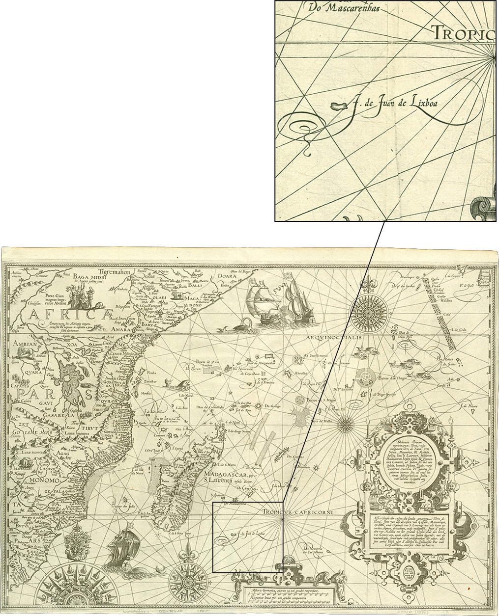 彼得·古斯于1680年绘制的这幅地图,有趣之处在于两座岛屿——里斯本胡安岛和多斯罗梅罗斯岛(意为“两名朝圣者”)。里斯本胡安岛被放置在距离马达加斯加东海岸数百千米的地方,在多斯罗梅罗斯岛的西边。然后,它们就像西班牙三张牌赌博游戏中的纸牌一样,被后来的地图绘制员们频频挪动位置,并被赋予新的地理坐标。直到1727年,这两座岛屿终于被法国地图绘制员让·巴普蒂斯特·唐维尔合为一体,放置在波旁岛(今称留尼旺)以南,靠近马达加斯加东海岸。没有人真正知道应该如何处理地图上的里斯本胡安岛。历年来,关于它的细节十分稀少(但并没有稀少得足以将它从地图上清除)。直到18世纪下半叶,开始有谣言说它是海盗的藏身之所。