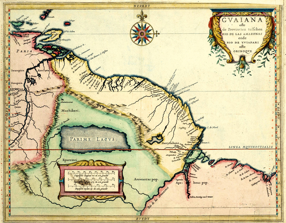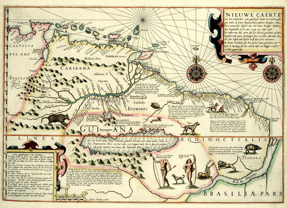 洪第乌斯的地图《展现圭亚那神奇、广袤、富饶土地的新地图》(1598),这幅地图来自沃尔特·罗利爵士的描述,图中展示的地区是今天的法属圭亚那。除了传说中的巴赖姆湖(标注为埃尔多拉多/马诺阿所在地),地图上的南部地区还出现了布伦米人(无头人),画面中还有对南美动物充满幻想的描绘。