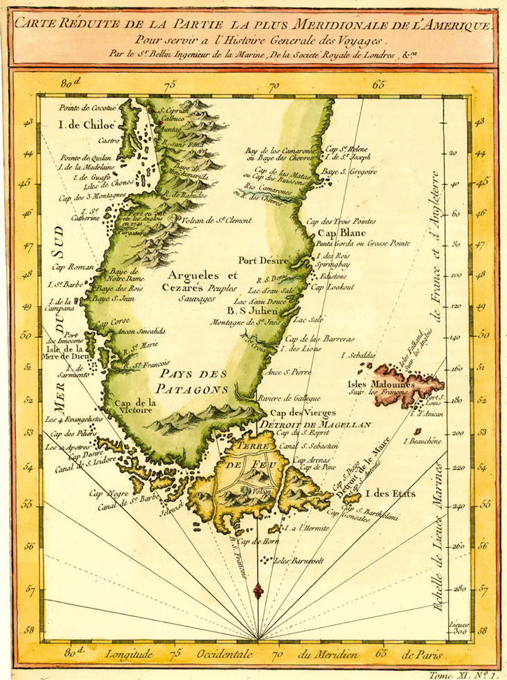 贝林的《南美洲中高纬度地图》(1750),图中展示了塞萨尔人生活的土地,位于 “Pays de Patagons”以北。