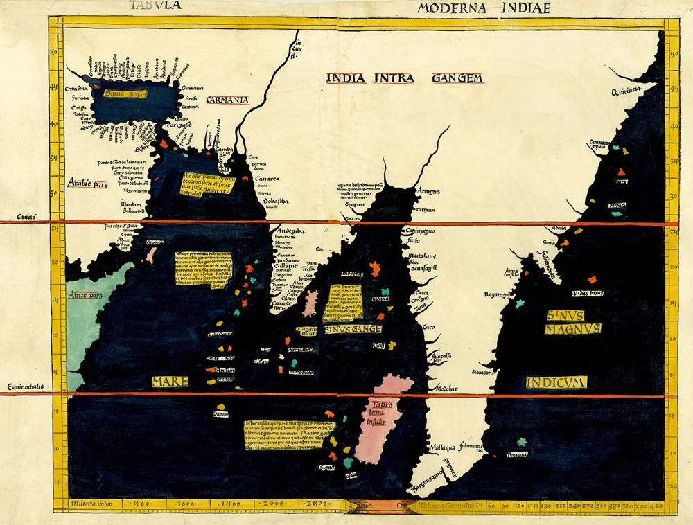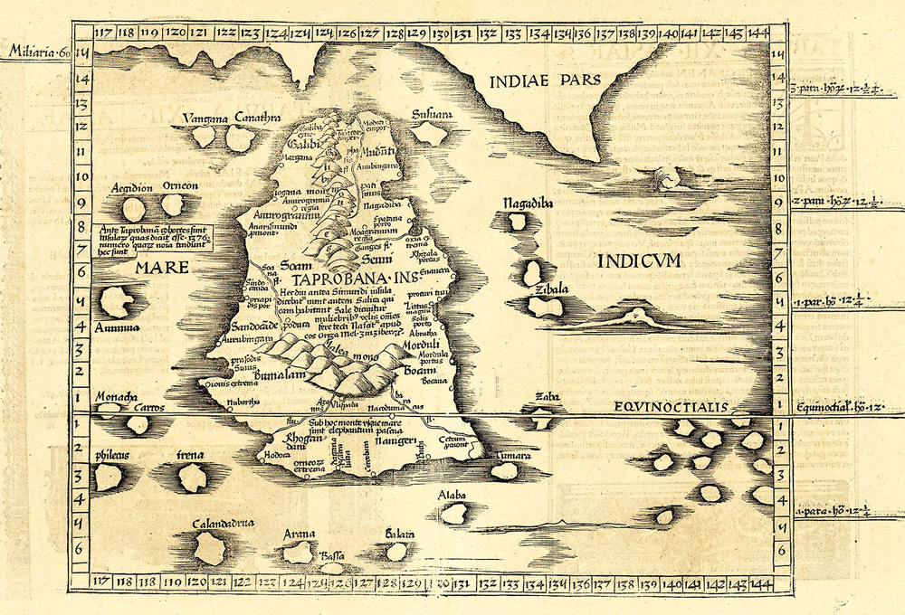 瓦尔德泽米勒绘制的印度洋、印度和东南亚及邻近地区[包括“塔普罗巴那岛”(此处标注为“Taprobana Insula”)],摘自他发表于1513年版的《地理志》。