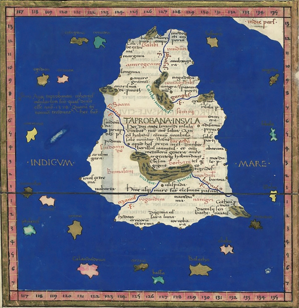 尼古拉斯·格曼努斯的《塔普罗巴那岛地图》,摘自《克罗狄斯·托勒密地图集》(1467)。