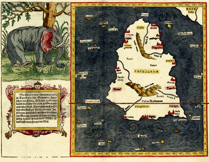 塞巴斯蒂安·明斯特于1570年绘制的塔普罗巴那地图,在画面左侧的装饰图案中描绘了一头大象。