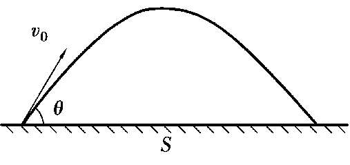 2.物体做如图2.20所示的斜抛运动。(1)已知抛出速度为v 0 与抛射角θ,求物体在水平面的落点与抛出点的距离s;(2)(该问用到了动量守恒)若一个人站在光滑冰面上,以相对自己的速度v 0 斜向上抛出一个球,当小球下落至抛出点高度时,水平位移为L。设人与球的质量分别为M和m,求抛出速度v 0 的最小值,以及小球抛出时速度与水平方向的夹角θ。