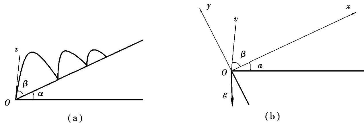 如图2.17(a)所示,一光滑斜面与水平面夹角为α,由斜面下端O向上斜抛一个小球,小球的初速度为v,抛射方向与斜面夹角为