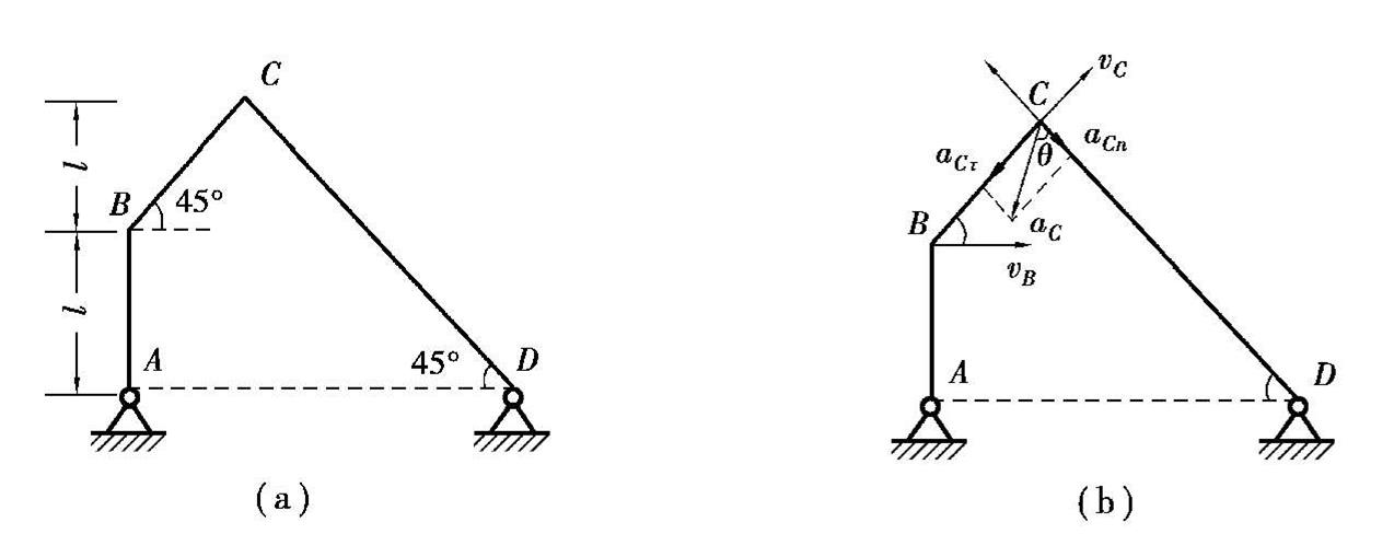 例3 图2.18(a)所示为用三角形刚性细杆AB、BC、CD连成的平面连杆结构图。AB和CD杆可分别绕过A、D的垂直于纸面的固定轴转动,A、D两点位于同一水平线上。BC杆的两端分别与AB杆和CD杆相连,可绕连接处转动(类似铰链)。当AB杆绕A轴以恒定的角速度ω转到图2.18(a)所示的位置时,AB杆处于竖直位置。BC杆与CD杆都与水平方向成45°,已知AB杆的长度为l,BC杆和CD杆的长度由图给定。求此时C点加速度a C 的大小和方向(用与CD杆之间的夹角表示)。