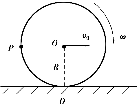 5.如图2.22所示,有一半径为R的刚性圆环竖直地在刚性水平地面上做纯滚动,圆环中心以不变速度v 0 在圆环平面内水平向前运动,求圆环上与圆心等高的P点的瞬时速度、切向加速度和法向加速度。