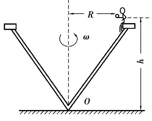 4.公园的转椅以恒定的角速度ω绕其竖直对称轴在水平面内匀速转动,转椅上的人以相对转椅v的速度平抛一小球。如图2.21所示,为使小球能击中转椅架底部中心点O,试求v的大小和方向(已知小球抛出点比O点高h,与竖直转轴的距离为R)。