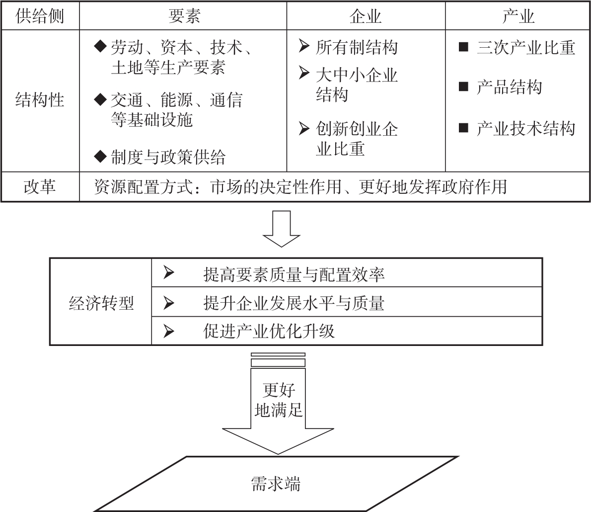 供给侧结构性改革,说到底最终目的是满足需求,主攻方向是提高供给体系质量和效率,根本途径是深化改革。供给侧结构性改革,就是用改革的办法推进供给结构调整,更好地满足需求,促进经济社会持续健康发展,可以形象地表述为:“供给侧结构性改革=供给侧+结构性+改革”。其中,供给侧包括生产要素、生产者和产业三个逐次递进的层次,构成经济增长的供给体系;“结构性”是指生产要素、企业和产业是按照什么比例进行配置的,不同的组合决定了经济增长的质量和效率;“改革”是指通过完善制度建设来调整生产关系,改变生产要素、企业和产业的比例关系,既包括数量关系调整,也包括质量提升(图1-2-1)。