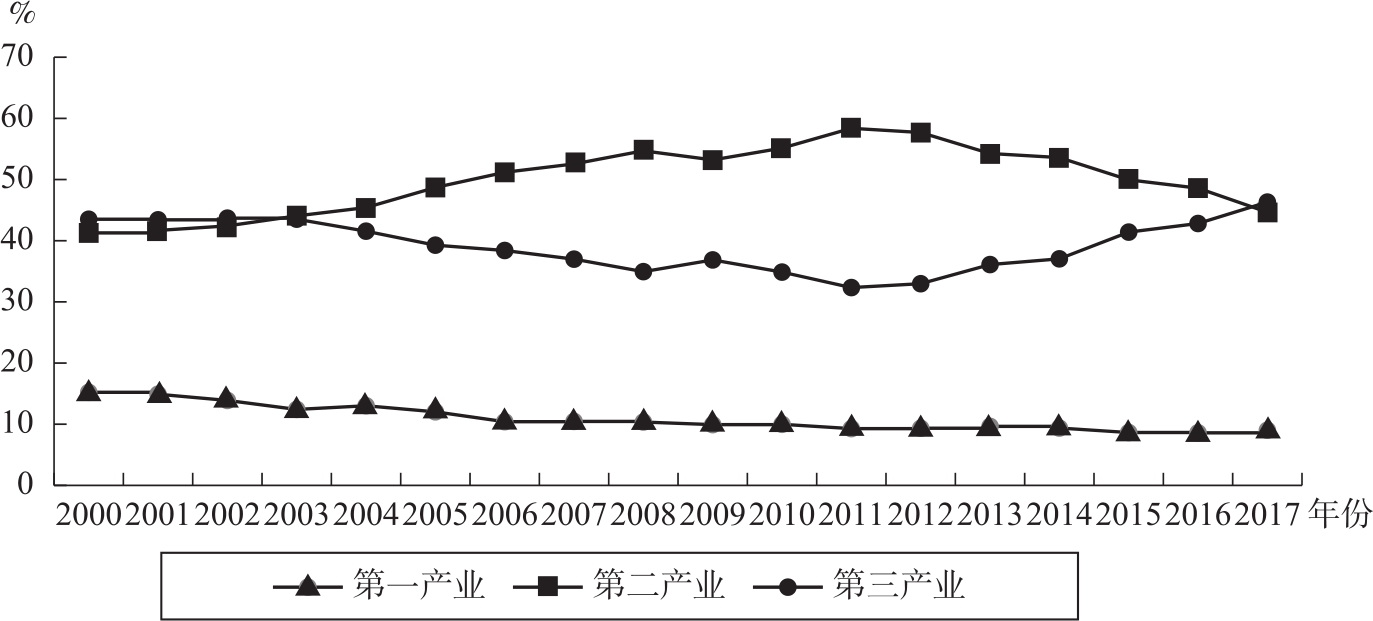 图1-5-5 2000—2017年青海省三次产业产值结构变化情况