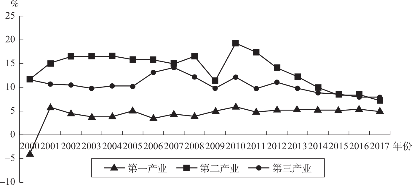 图1-5-3 2000—2017年青海省三次产业增加值增长速度变化趋势
