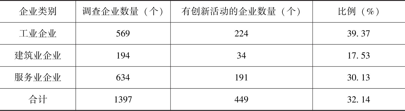 创新是企业发展的动力源泉,也是企业提高市场竞争力的重要手段,而开展创新活动的企业数量占调查企业总数的比重反映了企业开展各类创新及技术创新的活跃程度。青海省企业创新调查的统计数据显示,在调查的1397个企业中,有创新活动的企业仅有449个,占调查企业总数的32.14%(表1-5-2)。从不同行业企业创新的活跃程度来看,工业企业、建筑业企业和服务业企业中有创新活动的企业所占比重分别为39.37%、17.53%和30.13%。由此可见,工业企业创新活跃程度最高,建筑业企业的创新活跃程度较低。比较而言,青海省企业创新的活跃程度明显低于全国平均水平。