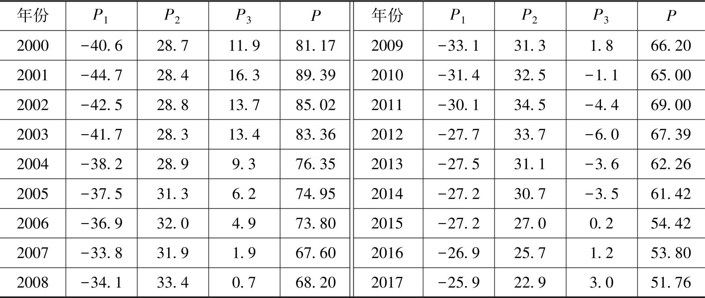 注: P 1 代表第一产业结构偏离度; P 2 代表第二产业结构偏离度; P 3 代表第三产业结构偏离度; P 代表三次产业结构偏离度。