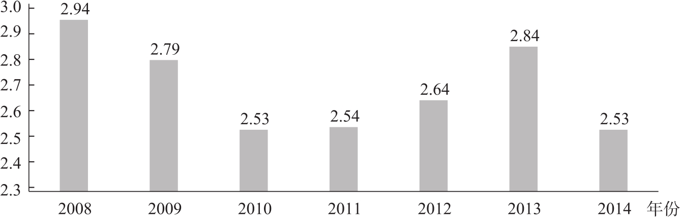 报告以市场化指数为依据来评估青海省的制度变迁情况。市场化指数越高,表明市场在资源配置中的作用越凸显,反之则表明政府对经济活动的干预越强。相关研究显示,2008—2014年青海省的市场化指数呈现出一定的阶段性特征:首先由2008年的2.94持续下降至2010年的2.53,然后再上升至2013年的2.84,2014年又回落到2.53(图1-5-1)。市场化指数的变化趋势大体上能够折射出青海省经济增长过程中政府和市场两种资源配置手段的博弈状况。2008年之前由于资源及资源品价格的上涨,经济增速相对有所保障,市场在资源配置中的地位相对较高,市场化指数也相应较高;其后在国际金融危机的影响下,经济增速明显下降,为保障经济增速能够达到预期目标,政府采取了比较明显的扩张性财政政策,以扩大投资规模来保障经济增速,从而导致市场化指数迅速下降;随后,经济新常态理论的提出改变了人们对于经济增速的固有认识,逐渐从理论和实践上阐述了经济由高速增长转向中高速增长的必然性,政府对经济活动的干预逐渐减弱,市场化指数明显提升。虽然2008—2013年青海省经济增速有所下降,但基本上还保持在10%以上,从2014年开始青海省的经济增速降至10%以下且表现出持续下降的趋势,政府通过扩大投资拉动经济增长的冲动再次得以显现,