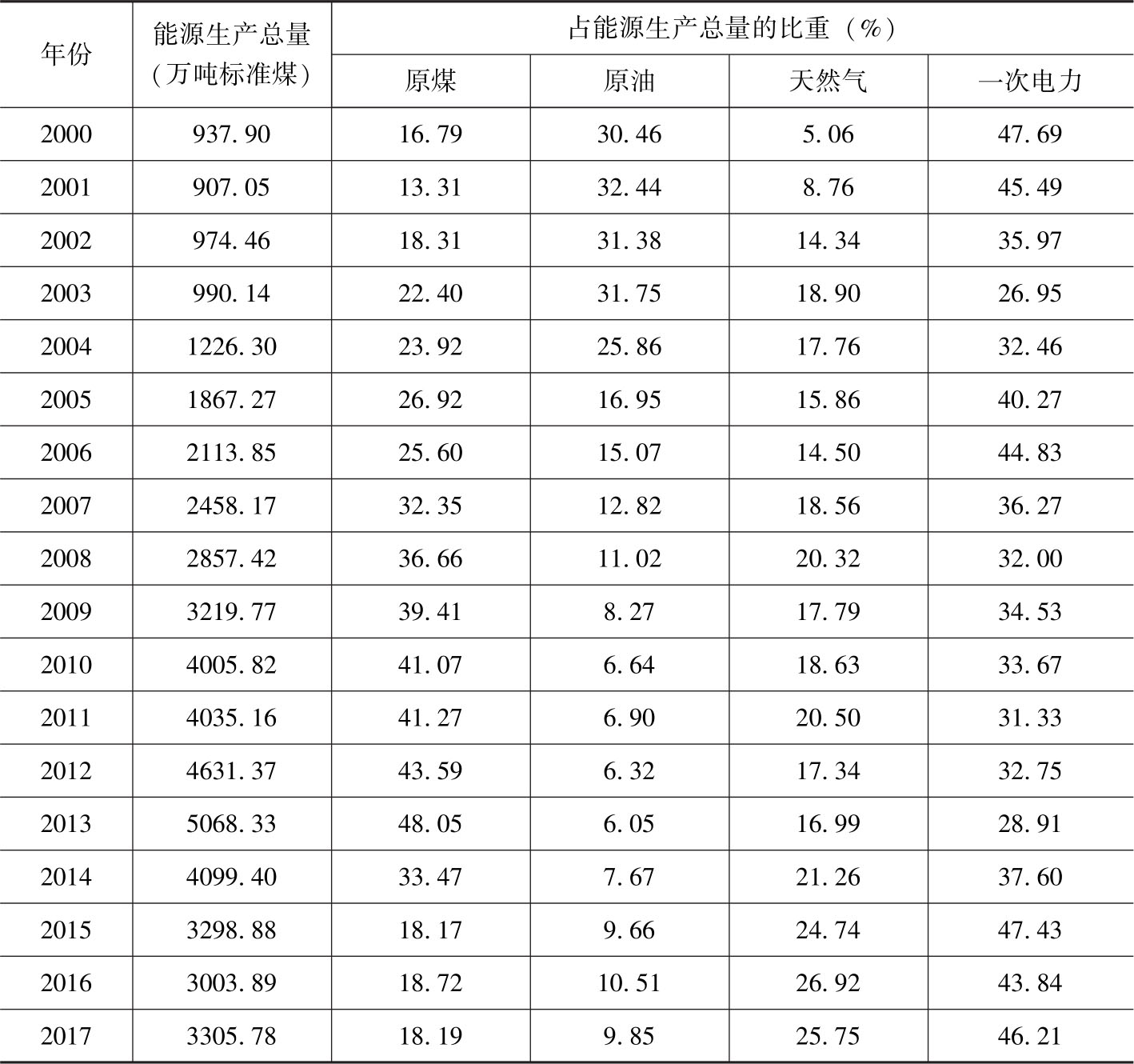 这表明青海省的经济增长具有比较明显的“高耗能”和“能源依赖”特征。2000—2017年青海省能源消费总量由897.23万吨标准煤持续上升至4202.46万吨标准煤,年均增长速度达到了9.51%。然而,能源生产总量呈现出先上升后下降再上升的变化历程,即由2000年的937.90万吨标准煤稳定上升至2013年的5068.33万吨标准煤,后持续下降至2016年的3003.89万吨标准煤,再上升至2017年的3305.78万吨标准煤。能源消费量的持续上升和生产量的波动,导致青海省能源自给率也出现不同程度的波动,2016年青海省能源自给率为近20年来的最低值,仅为73.08%。但是,结合能源生产的构成来看,原煤产量对青海省能源生产总量的影响较大,即原煤比重越高,能源生产总量越大;原煤比重越低,能源生产总量越小(表1-5-1)。这意味着调整能源生产结构,遵循比较优势原则扩大天然气、太阳能等清洁能源生产规模,发挥清洁能源的替代作用,提高能源自给率,将有效推进资源节约型和环境友好型社会的建设。