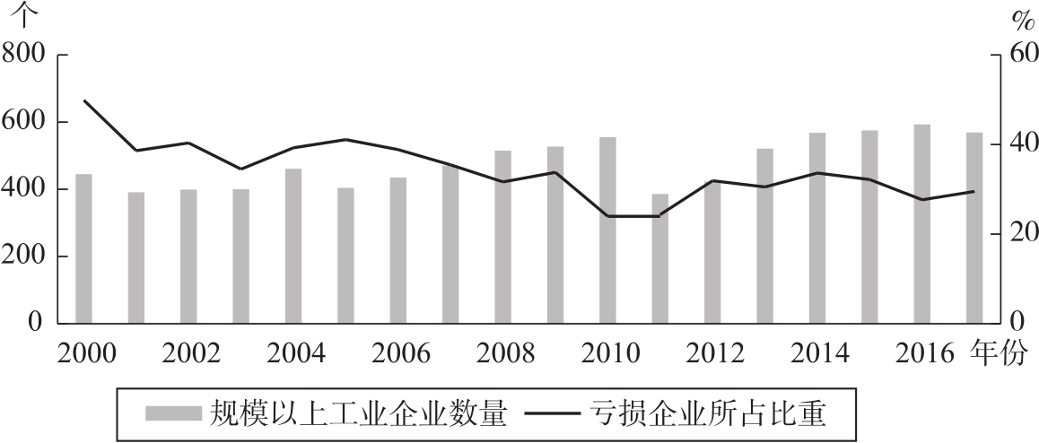 图1-5-2 2000—2017年青海省规模以上工业企业数量及亏损企业比例