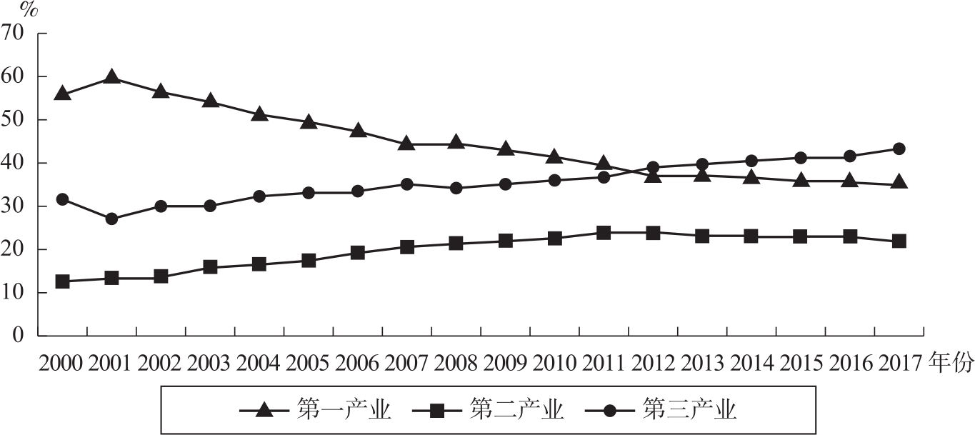 图1-5-4 2000—2017年青海省三次产业就业结构变化情况