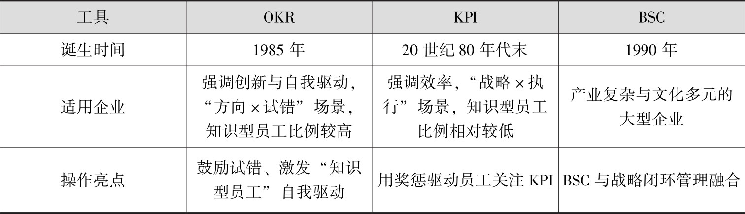 很多人说OKR是比KPI、BSC更新的管理工具,实际上这种认识是片面的、错误的。BSC诞生于20世纪90年代,KPI则于20世纪80年代末期开始逐步在西方国家企业使用,而OKR(IMBO)最早于20世纪80年代中期在英特尔公司率先使用(见表1-1)。从诞生时间来看,KPI、BSC都晚于OKR,因此OKR并不是“互联网时代诞生的新管理工具”。很多人误以为OKR是新的管理工具是因为OKR传入中国的时间要晚于KPI和BSC,但这并不能代表OKR是新的工具。