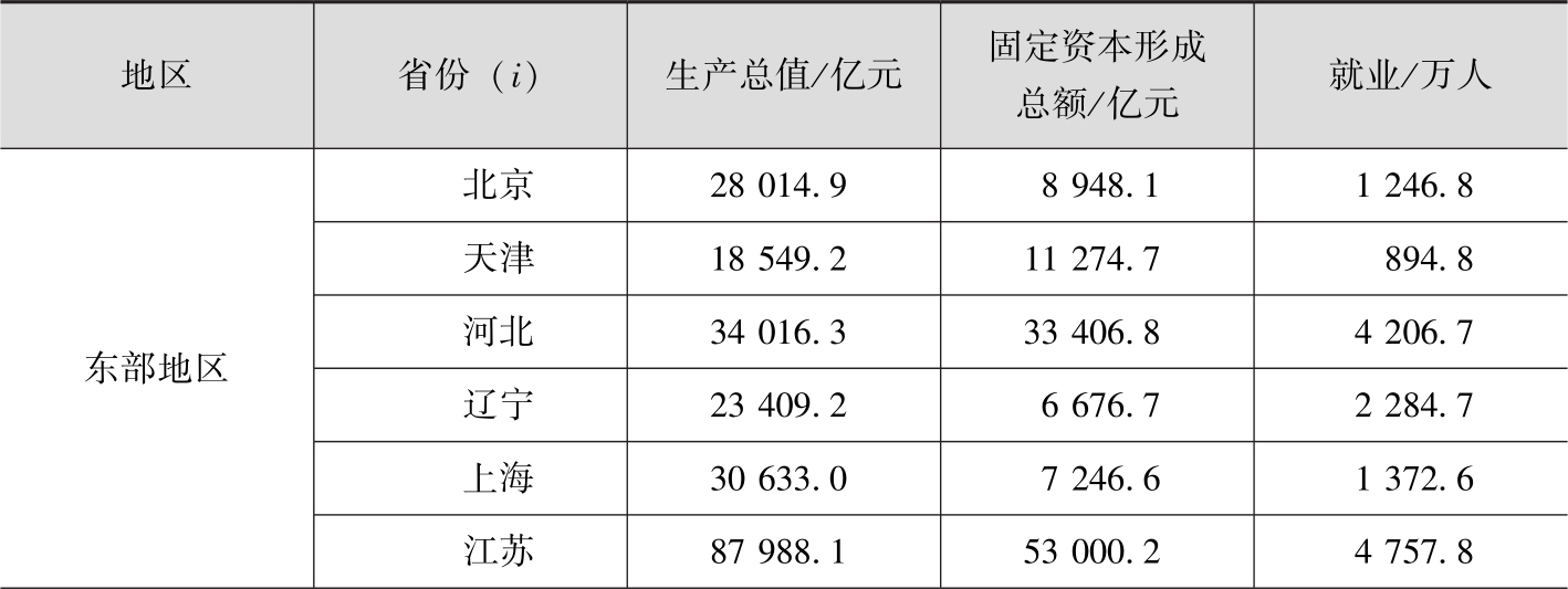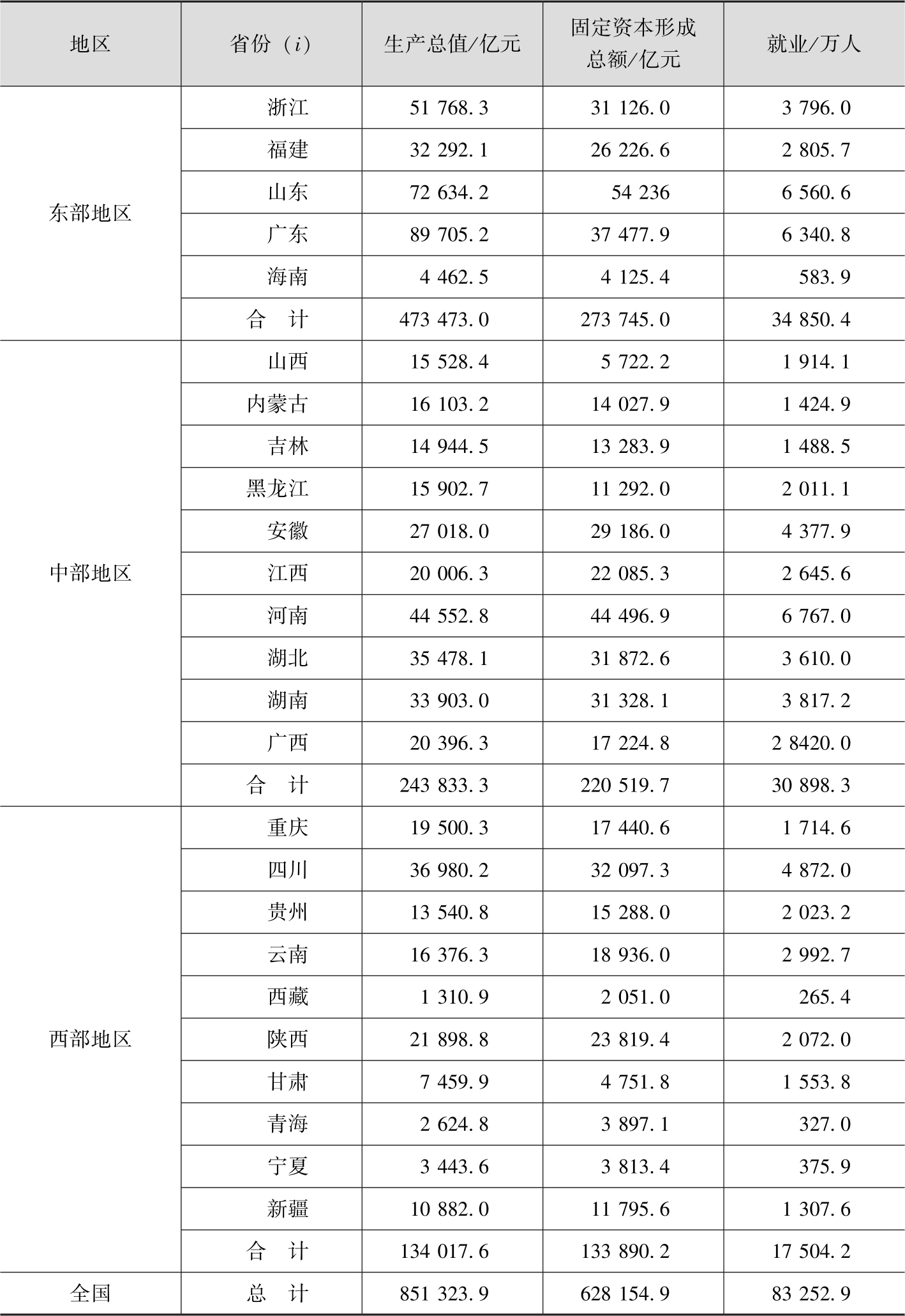 为了分析中国东、中、西部地区经济结构现状,可通过中国近年来的相关统计数据(见表2-1),依次计算出各省份的需求结构向量