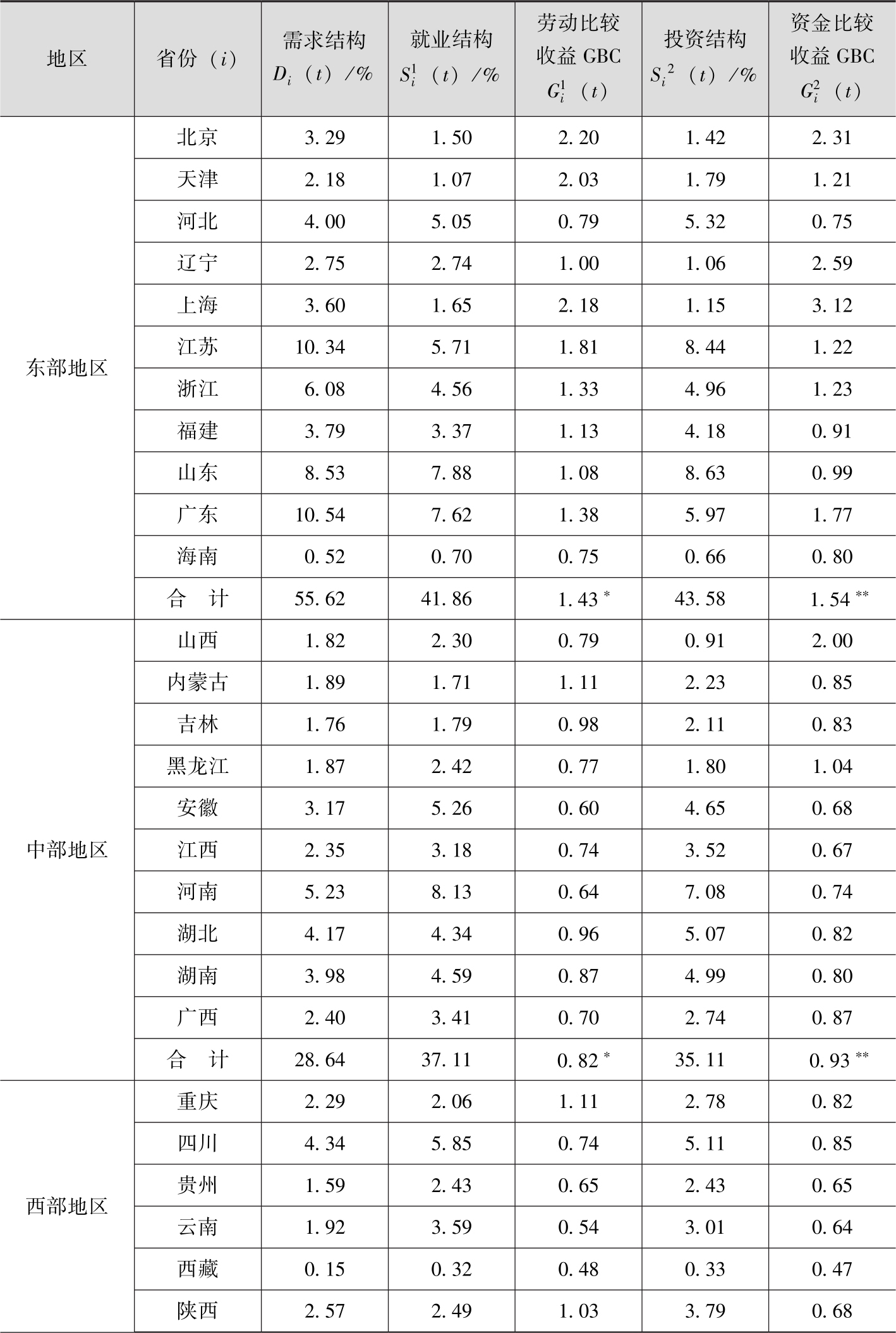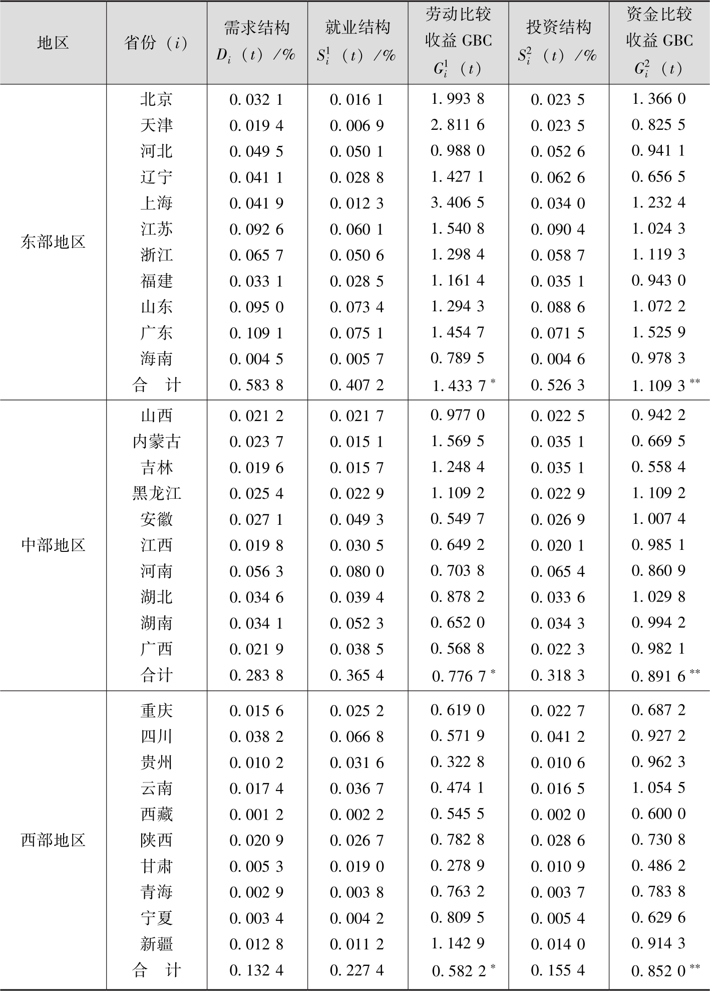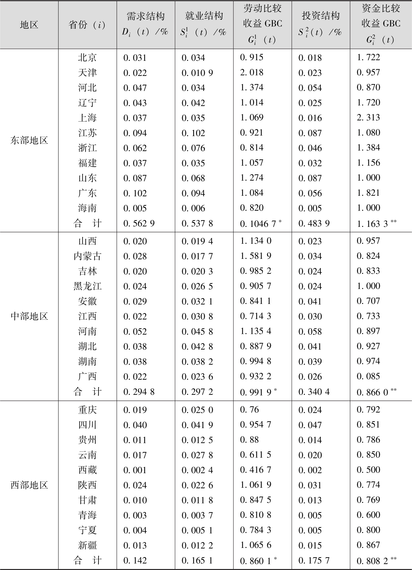 注: ∗ 与 ∗∗ 所示数值并非相关数据的合计,而是相应地区的平均值。其中, ∗ 是相应地区的劳动比较收益的平均值; ∗∗ 是相应地区的资金比较收益的平均值。