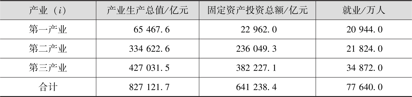 表2-5 中国三次产业的生产总值、固定资产投资总额和就业状况(2017年)