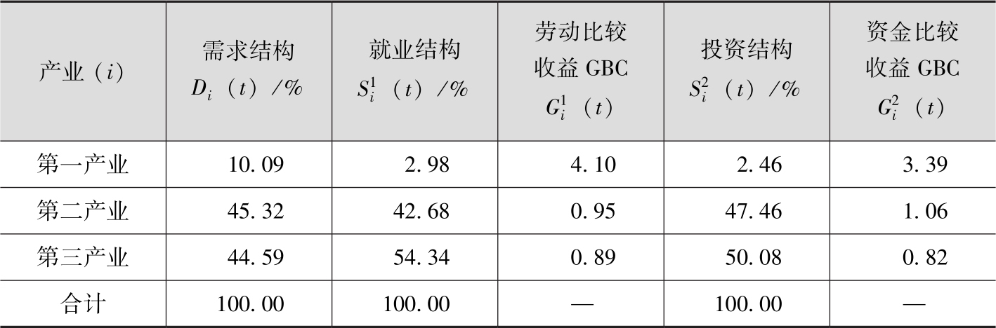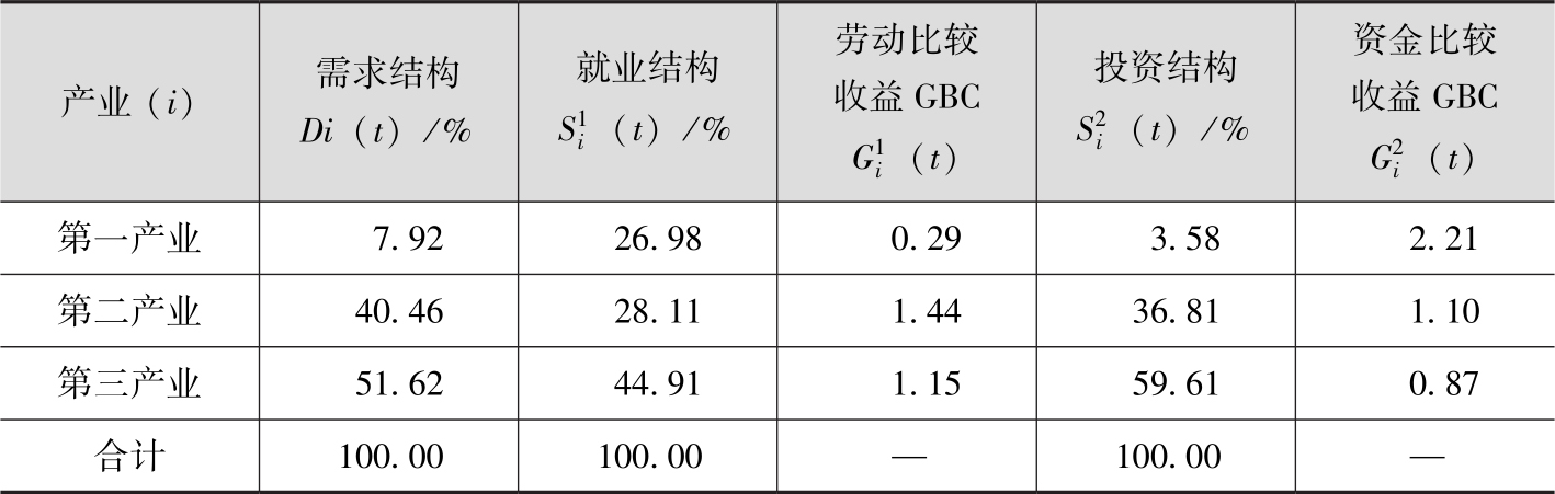 上述理论、模型和方法同样可以用于探讨产业投资与就业。只要将中国产业结构(即产业的需求结构)、产业的投资结构和就业结构现状(见表2-5)及其相应的比较收益计算出来并进行比较即可,计算方法同上,其结果见表2-6与表2-7。