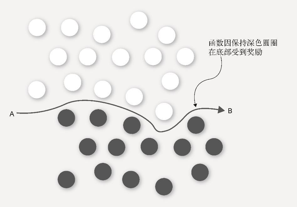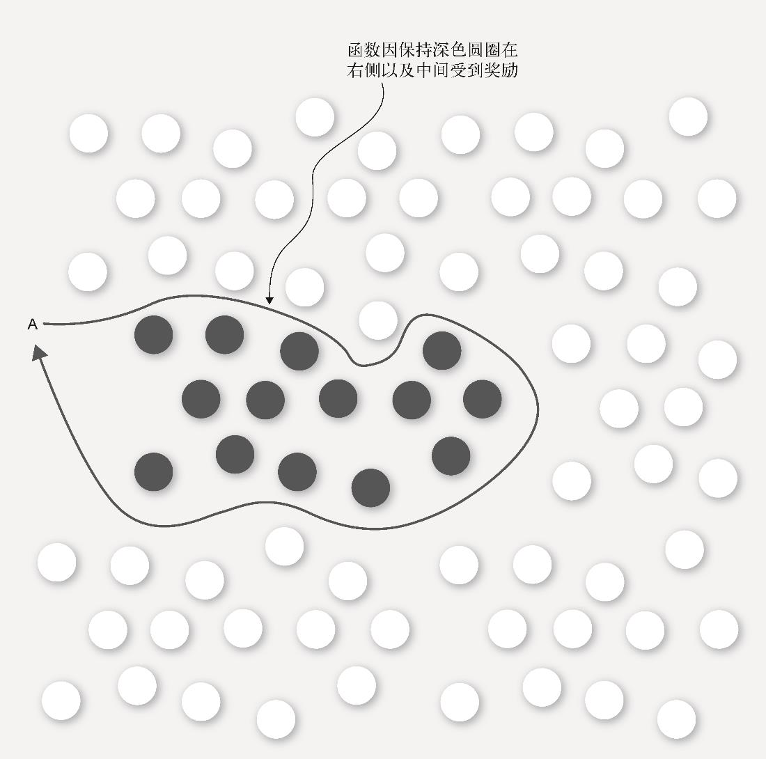 函数表现正确时,我们就奖励它。我们可以将这个过程视为奖励深色圆圈出现在其右边的函数,惩罚深色圆圈出现在其左边的函数。如果你还奖励左侧出现浅色圆圈的函数,惩罚右侧出现浅色圆圈的函数,就可以更快地训练它。