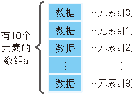 数组是指同样长度的数据在内存中进行连续排列的数据构造。用一个数组名来表示全体数据,通过索引来区分数组的各个数据(元素)。例如,一个 10 个元素的数组 a,其中的各个数据就用 a[0]~a[9] 来表示。[] 内的数字 0~9 就是索引。