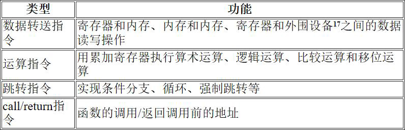 可能有些读者不知道机器语言和汇编语言的指令到底有多少种,因而对 CPU 的运行没什么概念。为了消除大家心中的这个疑团,接下来我们就来看一下机器语言到底有哪些种类。表 1-2 按照功能对 CPU 能执行的机器语言指令进行了大体分类。这里没有列出指令的具体名称(汇编语言的助记符)。看完表后你会惊奇地发现,原来 CPU 可以进行的处理非常少。虽然高级编程语言编写的程序看起来非常复杂,但 CPU 实际处理的事情就是这么简单。这样一来,大家是不是能够消除“计算机机制看起来很难”这个印象了呢?