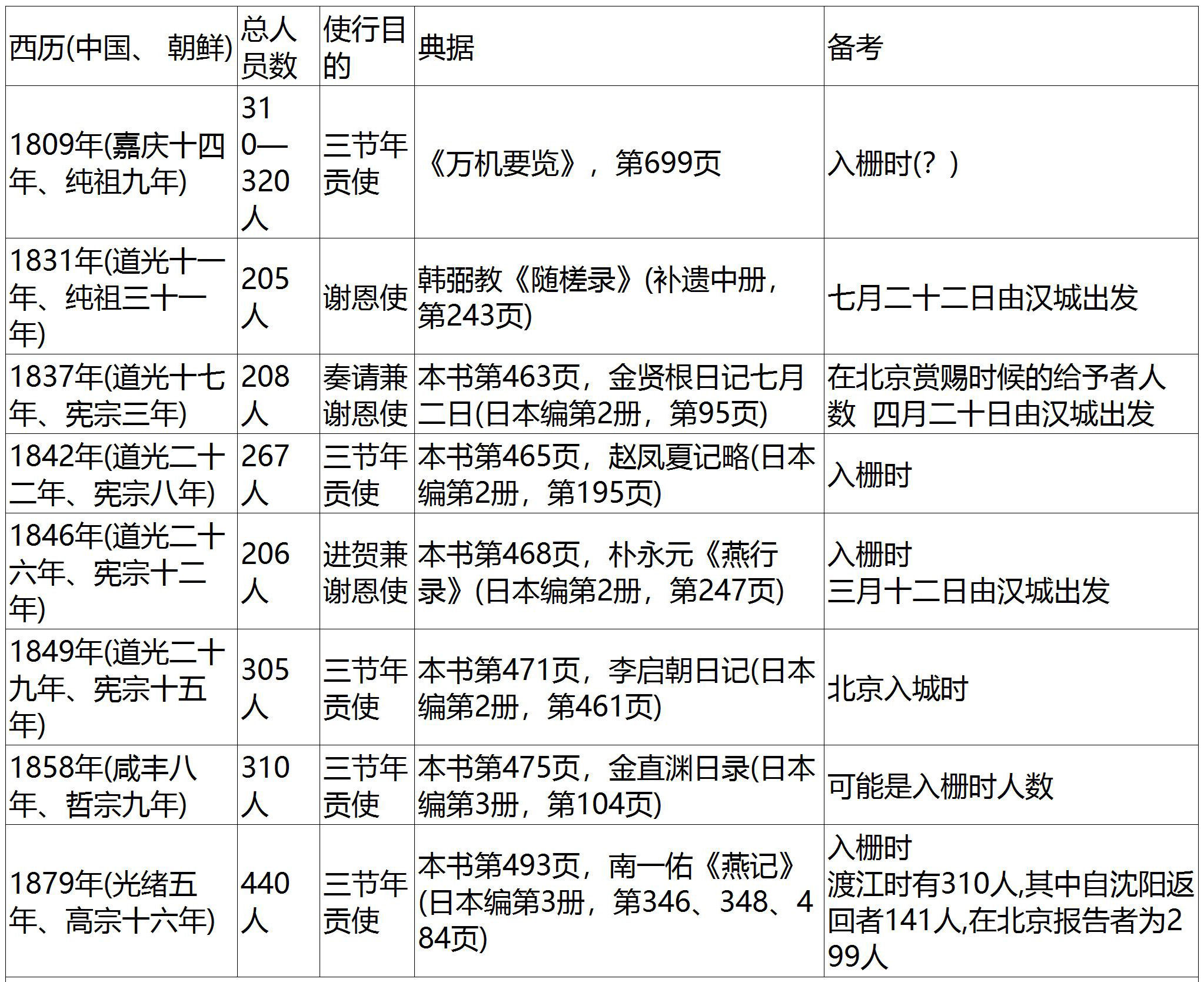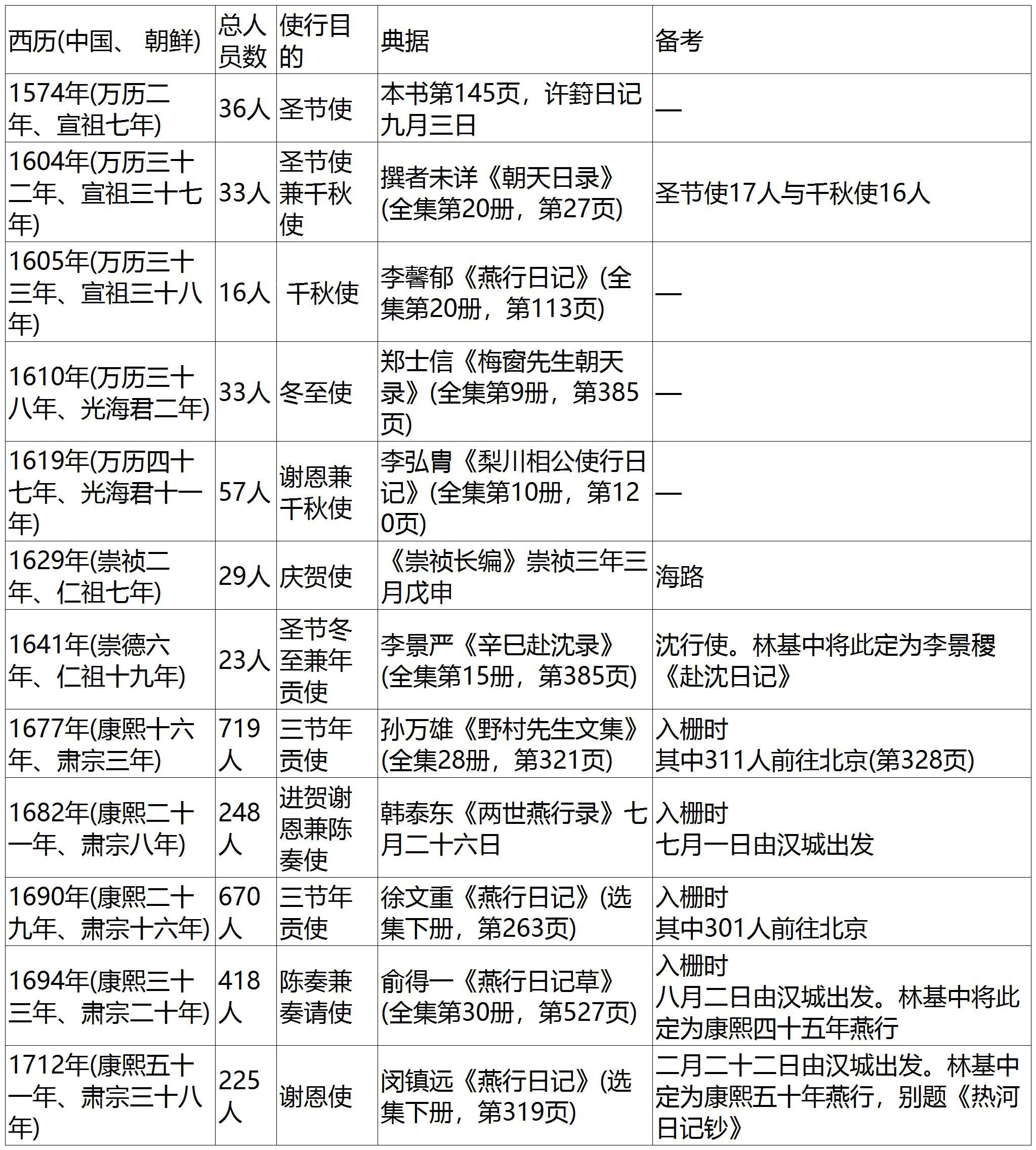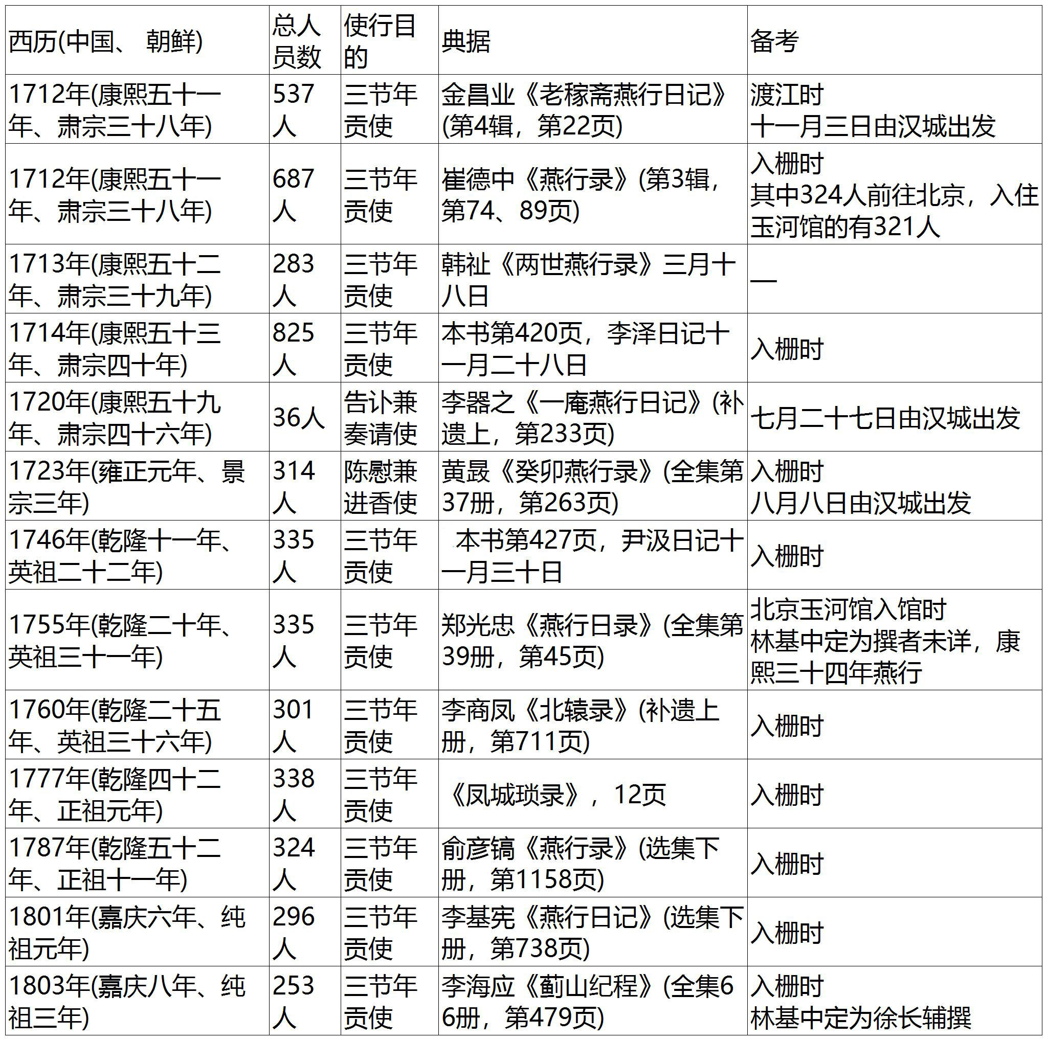 下面要论述的问题是:每一次的燕行使团有多少人参与呢?在朝鲜通信使的场合,每次的人员都是四百数十人到五百人左右,其中有一百数十人停留在大阪。 注7 那么,朝鲜燕行使的话,每次大概有多少人参与呢?以下是在以燕行录为中心的史料中,我所注意到的几则数据。
