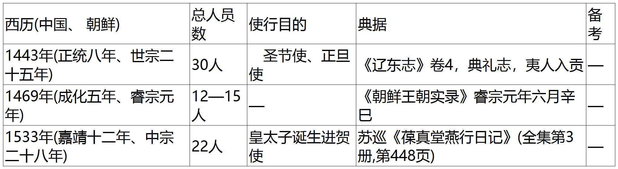 此外,对于燕行使团中谁带有何种职衔这一问题,时代较早且作者不详的《朝天日录》中对此有些记载。这是在1604年(万历三十二年、宣祖三十七年),由圣节使与千秋使合并编成燕行使团时的情况。据该书记载,圣节使一方有正使和书状官共2人,通事(通译)4人,军官4人(其中子弟军官1人),医生1人,此外养马、奴、厨师共计6人,一共17人。另一边是千秋使,正使和书状官共2人,通事5人,军官3人(其中子弟军官1人),医生1人,养马、奴共计5人,一共16人。两使合起来是33人。这一人员数大概是根据朝鲜方面自己的限制而来的,因为据前列一览表显示,1469年的燕行使团同样是极为朴素的人员配置,不仅见不到制述官和书记,也完全见不到商人和旅游观光的随行者。这表明该使节团是纯正的事大与朝贡使节团,参加使节团的人都是以事大和朝贡为明确目标,并为此承担某些职务。