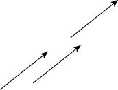 假定两辆汽车在路上彼此经过,且示速器上都显示40英里每小时,则我们可以用箭头指向相反方向的两个矢量来表示它们的速度,正如地铁列车指示“上行”、“下行”的箭头必须指向相反的方向。不过所有上行列车,无论经过哪个车站,或者在哪条线路上行驶,只要速率相同,都有相同的速度,这个速度可以用一个矢量来表示。矢量并没有说明列车经过哪一个车站或者沿着平行轨道中的哪一条在行驶。换句话说,根据习惯,图中所有这些矢量都可以认为是相等的;它们处于相同或平行的直线上,长度相等,箭头指向同一方向。接下来一幅图显示的矢量各不相同,因为它们要么长度不同,要么方向不同,要么长度和方向都不同。还可以用另一种方式来画这四个矢量,使之从同一点岔开。由于出发点并不重要,所以这些矢量既可以表示从同一地点开出的四辆汽车的速度,也可以表示在不同地点以指定的速率和方向行驶的四辆汽车的速度。