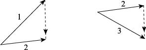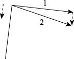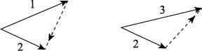 我们把虚线矢量称为“速度的变化”。它的起点是第一个矢量的末端,终点则是第二个矢量的末端。初看起来,对速度变化的这个定义不仅人为,而且没有意义。在矢量1和矢量2方向相同的特殊情况下,这个定义要清楚得多。当然,这意味着回到了直线运动的情形。如果这两个矢量有相同的起点,那么虚线矢量仍然是把它们的终点连接起来。现在,此图与前面那幅图完全相同,以前的概念重新成为新概念的一种特殊情形。需要指出的是,在图中我们不得不把两条线分开,因为否则它们就重合在一起无法区分了。