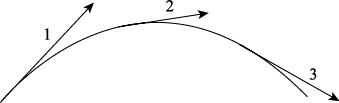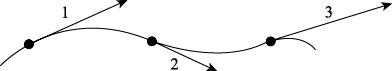下一幅图中绘出的三个速度矢量对应于一个质点沿曲线运动时的三个不同位置。这里,速度的方向和大小(如矢量的长度所示)都是随运动而变化的。