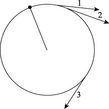 接下来一幅图中的矢量表示所有外力都消失时所猜测的匀速运动方向,那就是所谓的切线方向。如果透过显微镜来看一个运动着的质点,我们会看到一个非常小的曲线部分,它显现为一小段弦。切线就是它的延长线。于是,所画的矢量表示给定时刻的速度。速度矢量就在切线上,它的长度表示速度的大小,比如汽车示速器上显示的速率。